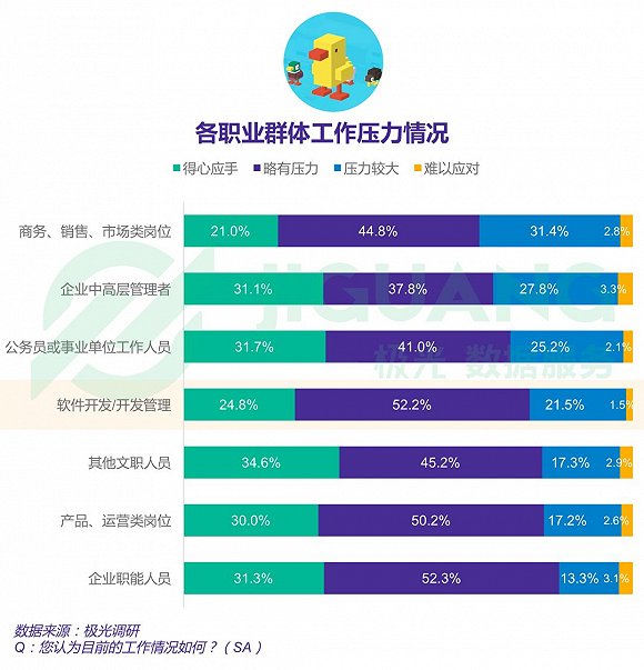 在各职业群体中,程序员自我评估的工作压力并不突出