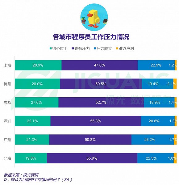 上海程序员压力较小,28.9%上海程序员认为目前的工作处理起来得心应手如果压力有重量,27.9%的广州程序员和24.3%的北京程序员可能已经被压弯了腰