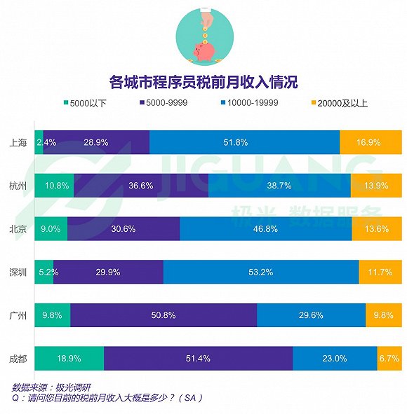 受访的上海程序员总体收入水平最高,16.9%上海程序员月入2万及以上广州和成都的程序员超半数月收入在一万元以下