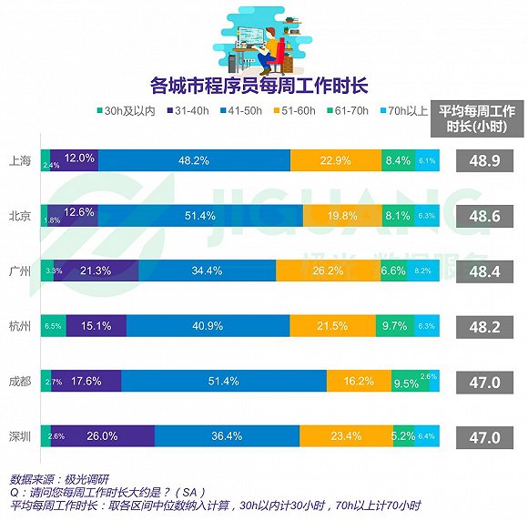 上海程序员最忙,平均每周工作时长为48.9小时深圳程序员较闲,平均每周工作时长为47.0小时,28.6%每周工作时长在40小时及以内广州程序员,有的很忙有的很闲,41%广州程序员每周工作50小时以上,但也有24.6%每周工作40小时及以内