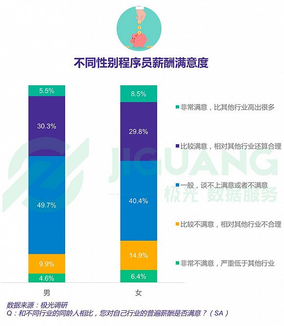 女性程序员对行业薪酬非常满意和非常不满意的比例都高于男性