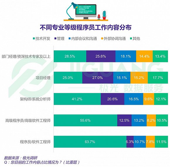 对于管理专业等级的程序员,内外部沟通协调工作更重,内外部会议和沟通在项目经理工作中占比30.3%,在部门经理/资深技术专家及以上中占32.5%