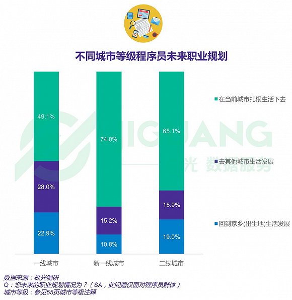 想说爱你不容易,仅49.1%的一线城市程序员计划在当前城市扎根生活,而74%的新一线城市程序员和65.1%的二线城市程序员有同样规划逃离北上广深,28%的受访程序员规划去其他城市生活发展