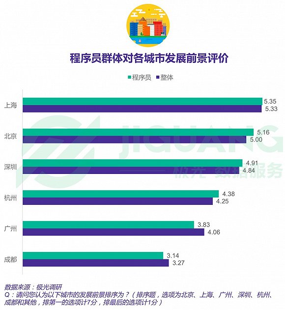 受访程序员群体认为,各主要城市发展前景排序为:上海-北京-深圳-杭州-广州-成都程序员群体对上海、北京、深圳、杭州四城市评价高于整体受访者评价水平