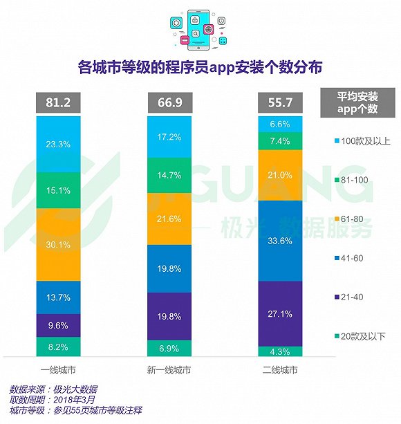 巨能装:一线城市程序员平均安装81.2个app,明显多于新一线和二线城市程序员30.1%的一线城市程序员安装app为61-80个,23.3%安装app在100个及以上