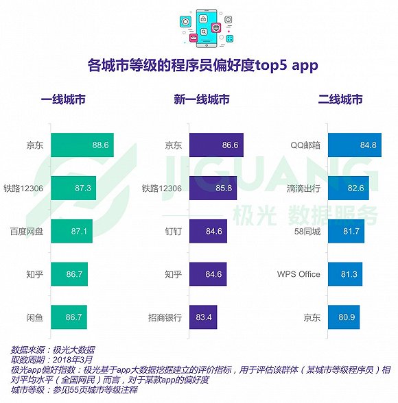 征服一线和新一线程序员的不止京东,还有铁路12306二线城市程序员最偏好QQ邮箱,其次是滴滴出行