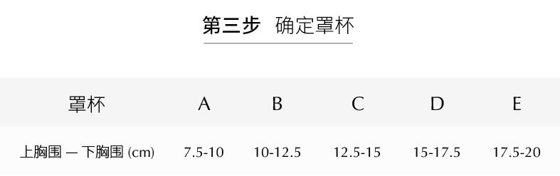 上胸围值减去下胸围值,如果二者相减:差值7.5~10cm,为A罩杯;差值10~12.5cm,为B罩杯;差值12.5~15cm,为C罩杯;以此类推。