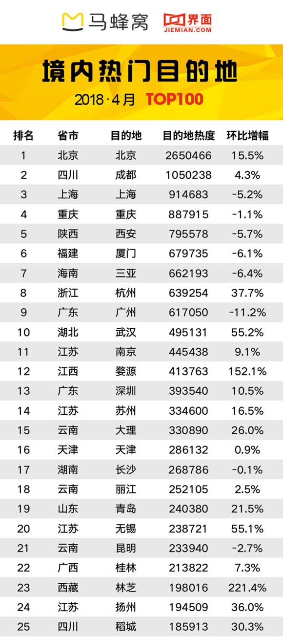 4月境内热门旅游目的地排行榜显示,排在前十的分别是北京、成都、上海、重庆、西安、厦门、三亚、杭州、广州和武汉。