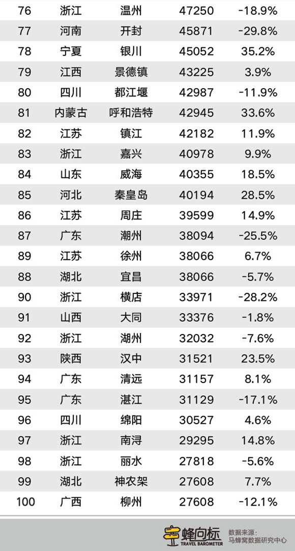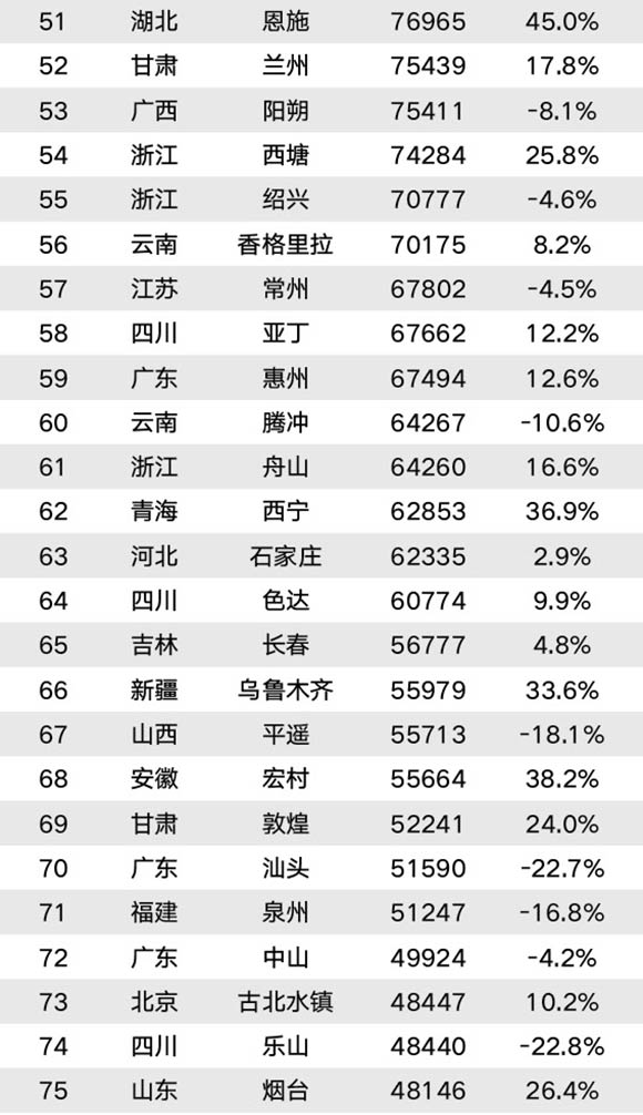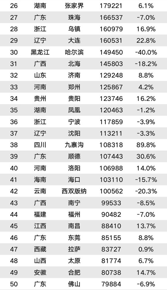 境内目的地涨幅排在前十的分别是西藏林芝、江西婺源、四川九寨沟、湖北武汉、江苏无锡、湖北恩施、安徽宏村、浙江杭州、青海西宁和江苏扬州,涨幅均在35%以上,其中林芝(221%)和婺源(152%)涨幅继续破百。