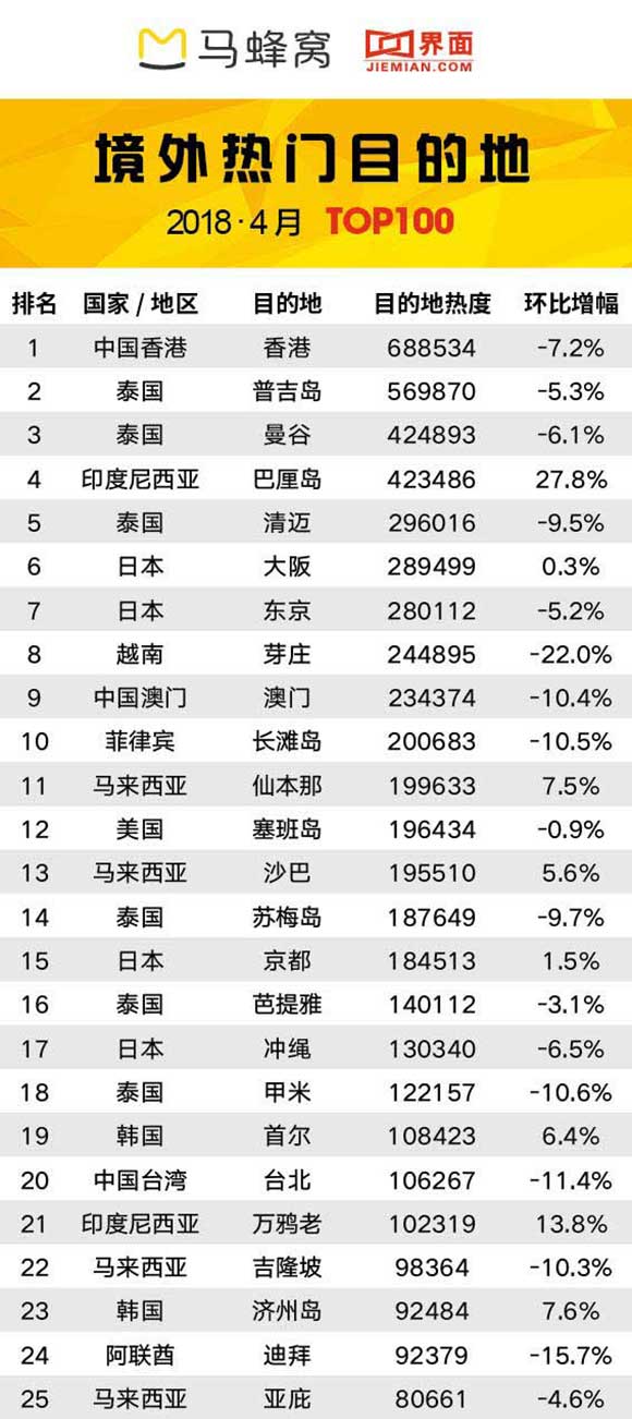 4月境外热门旅游目的地排行榜显示,排在前十的分别是中国香港、普吉岛、曼谷、巴厘岛、清迈、大阪、东京、芽庄、中国澳门和长滩岛。