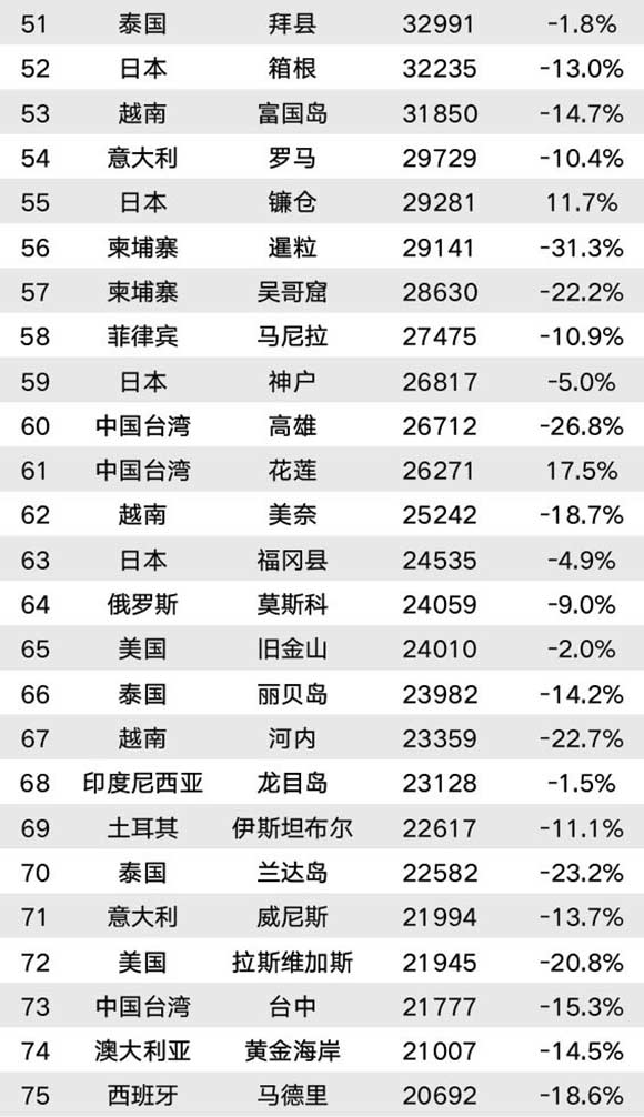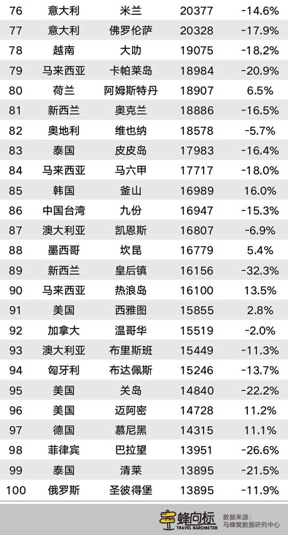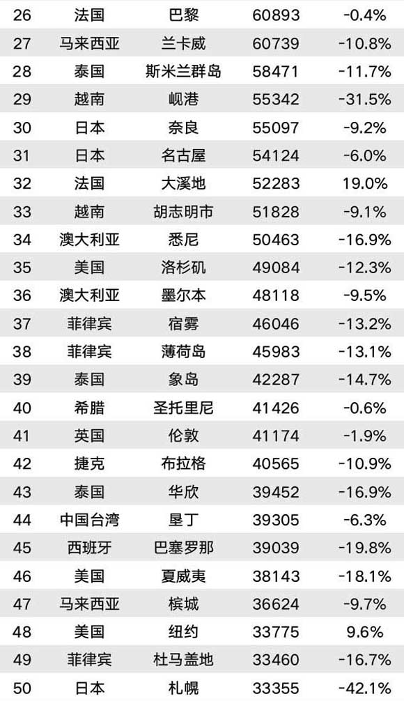 涨幅排在前十的境外目的地分别是印度尼西亚巴厘岛、法国大溪地、中国台湾花莲、韩国釜山、印度尼西亚万鸦老、马拉西亚热浪岛、日本镰仓、美国迈阿密、德国慕尼黑和美国纽约。这些目的地涨幅均在10%及以上。