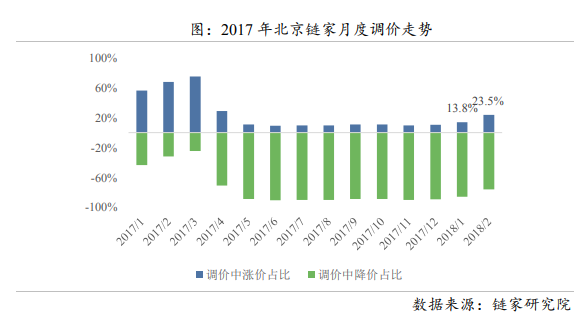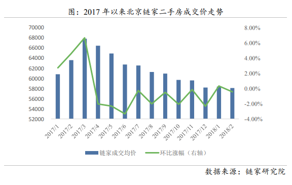 2017年的“3·17新政”结束了北京房价连续17个月上涨的势头,随后价格出现连续9个月的下跌,累计平均跌幅在15%左右。2018年3月北京二手房均价为58527元/平方米,与2016年12月的水平接近。成交量更是出现大幅下滑。