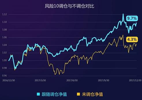理财魔方公布的数据显示,风险10组合2017年调仓后收益为9.7%,而不调仓的情况下,收益仅为4.3%,也就是说2017年调仓为组合收益贡献了近5.4%。