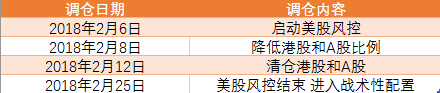 今年以来,风险10投资组合共实行了四次调仓,且调仓信号的发出与市场波动的时间基本吻合。2月6日美股暴跌,平台及时启动了美股风控,而随后,全球股市应声齐跌,2月8日,系统降低港股和A股的比例,至2月12日清仓港股和A股。2月25日,开始少量配置美股,并配置了相当比例的黄金以对冲美股下跌的风险。