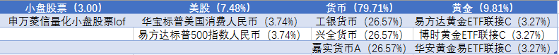 由上表可以看出,这一投资组合中,作为低风险资产的货币型基金占比最高,达79.71%;其次是股票型基金,A股与美股合计占比为10.48%;此外,作为避险品种的黄金配置比例也高达9.81%,仅小幅低于股票的配置。