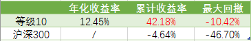 由上表可知,风险10组合年化收益率为12.45%,表现尚可。近三年以来累计收益率达到了42.18%,而沪深300则下跌近4.64%,累计收益大幅跑赢沪深300指数46.82%,组合长期收益表现可圈可点。
