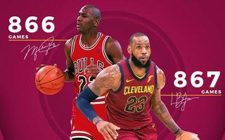 40:在连续866场得分上双的比赛中,乔丹40+的场次超过得分不足20分比赛的两倍(159-78),而867场连续上双比赛中,詹姆斯有44场40+的比赛。