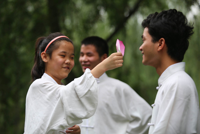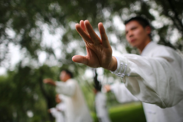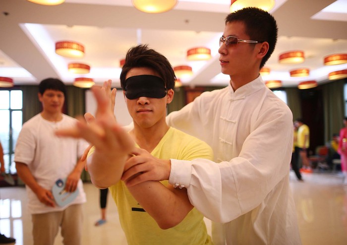 1. 如同每个朝气蓬勃的北京清晨一样,身着白色练功服的郑元康和同伴们已经在草地中摆开太极拳的起势。双腿缓缓分开呈马步站立,双臂向前伸展,手形为“瓦垄掌”,清风徐徐拂动着衣襟,身体也随风势一般向右转动,掌形已在左右轮转中变为拳,右拳指向天空,左拳与左腿下压形成“雀地龙”招式……郑元康和他的同伴们在这并不算晴朗的清晨里认真练习着太极,看似和常人无异,但他们全是盲人。