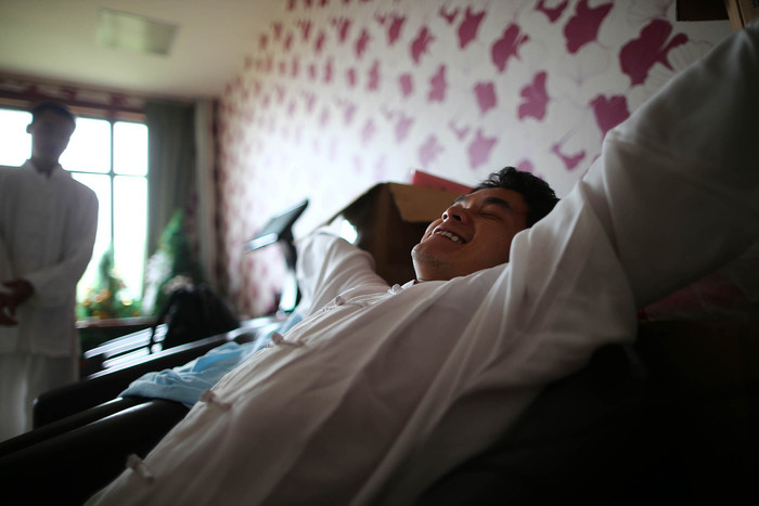 3. 郑元康穿上练功服,准备练功。现在的郑元康已经成为侠友新社的一名助教,不仅教盲人学习太极,甚至还能指导健全人练习;他不仅通过太极找到了光明,还努力帮助别人驱走黑暗。
