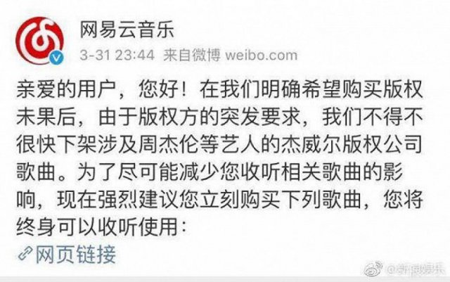 在 3 月 31 日晚接近零点,网易云音乐官方微博发布了一条消息称:" 在我们明确希望购买版权未果后,由于版权方的突发要求,我们不得不很快下架涉及周杰伦等艺人的杰威尔版权公司歌曲。为了尽可能减少您收听相关歌曲的影响,现在强烈建议您立刻购买下列歌曲,您将终身可以收听使用。"