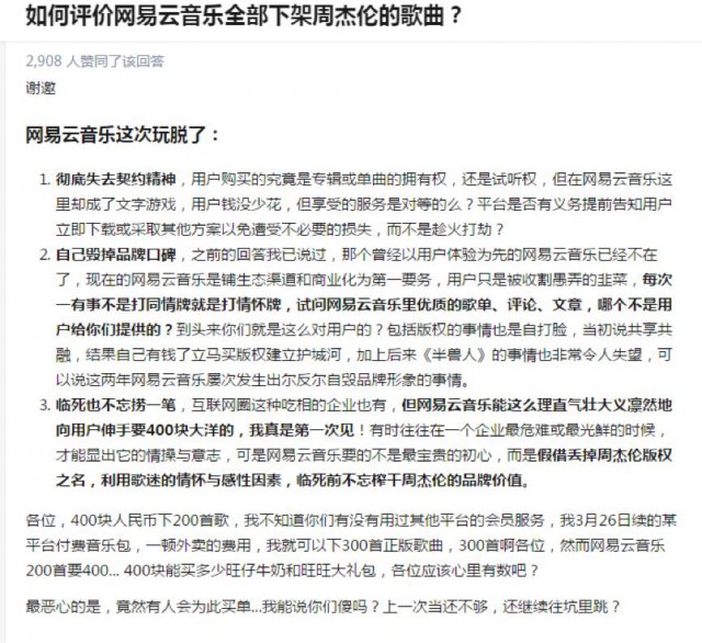 在知乎上,还有网友指出此次网易云音乐上线周杰伦专辑的微博声明,有两个方面可能会为人诟病。一是网易在微博提到一次付费终身免费,那么之前花钱购买专辑的用户权益该如何保障呢?在这一点上笔者目前没有找到相关的声明。