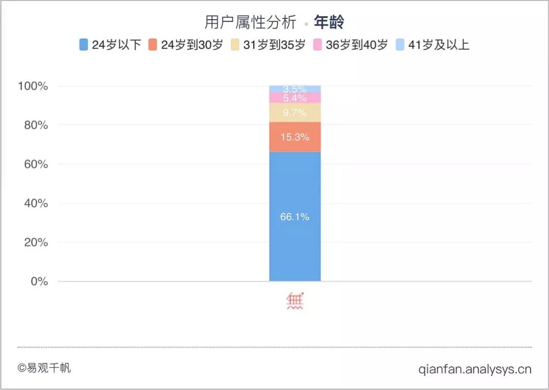 虽然在颜值社会,自拍已经不再是女孩的专属,但女性依然是美颜拍照应用的核心重度用户。根据易观千帆2018年2月数据,无他相机用户女性占比高达85.32%,除了性别偏好是显而易见的外,在年龄分布上年轻化趋势也十分明显,24岁以下用户占比达到66.06%,紧随其次的是24岁到30岁用户,占比15.34%。
