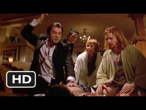 这部电影里最著名的场景之一就是“扎针”镜头了。Mia因为吸海洛因过量,Lance给了Vincent一只黑色马克笔和一只大号肾上腺素注射器,然后Vincent大力扎在了Mia的胸口上。这一幕看上去又紧张又真实,这一幕结束于Vincent把针头从Mia胸口扯出来。