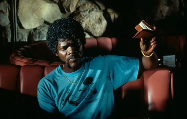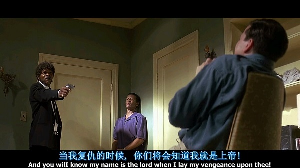 Jules(塞缪尔·杰克逊饰)杀人前必读的关于《圣经》中的引段仍然是电影中最经典的场景之一。在就着Brett的雪碧吃下他的卡胡纳汉堡(这汉堡名字是昆汀自己瞎编的,后来在他的其他电影里面出现了好几次)后,Jules念着这一段“那些胆敢残害荼毒我同伴之人,我将向他们大施报复。到时候,他们就会知道,我就是耶稣。”,然后把Brett打得浑身是洞。