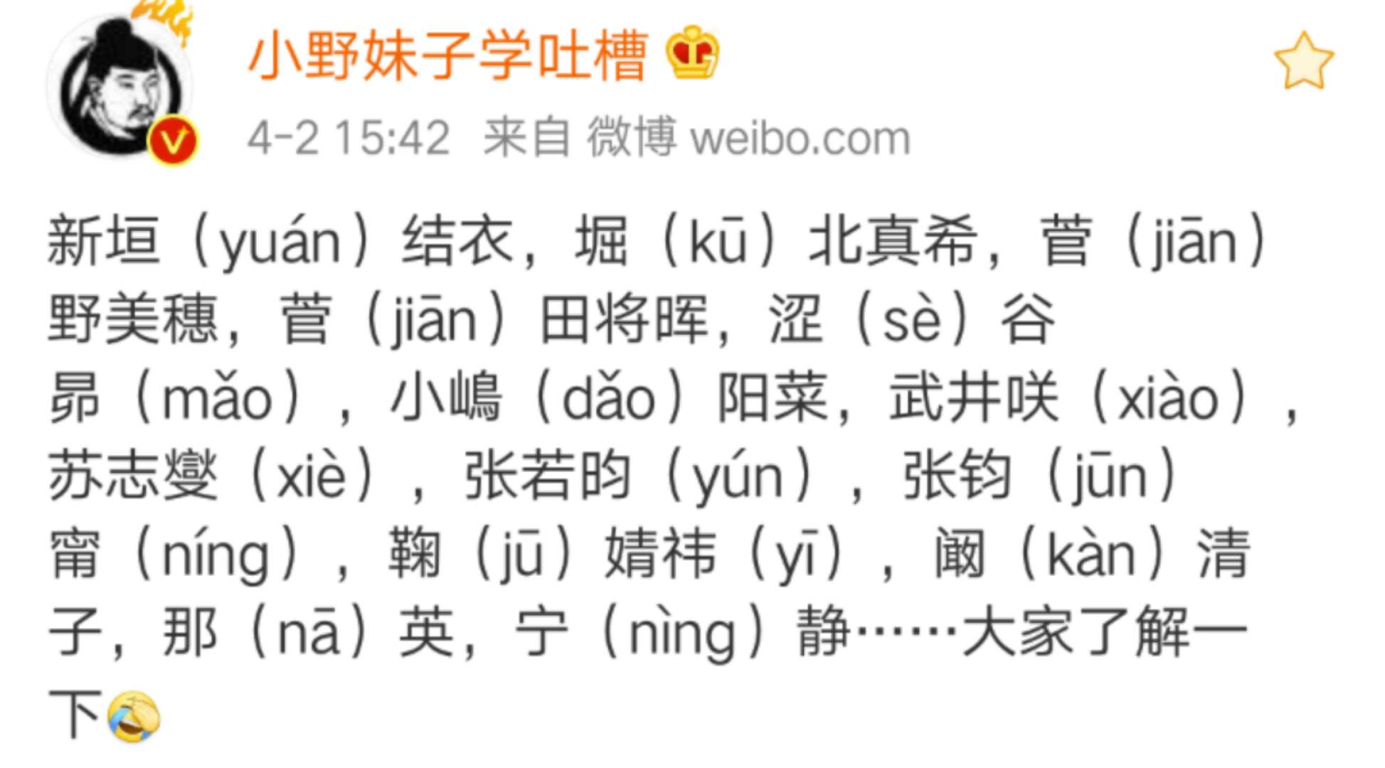 我猜肯定有人叫过新huan结衣、小粟(su)甸(dian)、张若jun、张钧mi、鞠婧wei、gang清子...