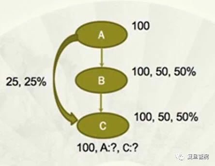 我们假定有A、B、C三家公司,每家公司的注册资本都是100万元,A投资给B公司50万元,占B公司股权的50%,B投资给C公司50万元,占C公司股权的50%。如此一来,A实际上给C公司投资了25万元,即A拥有25%的现金流量权(Cash Flow Right),但是却通过控股链条获得了50%的控制权或投票权(Voting right)。在这种情况下,我们很好地实现了以小博大,即以25万元控制了100万元,C公司注册资本100万元中其他的75万元来自于其他股东。