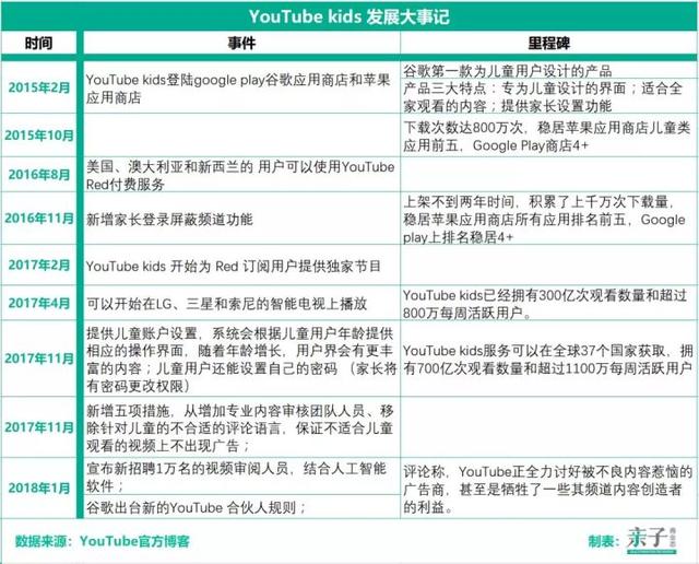 截至2017年11月,YouTube Kids 已走进全球37个国家,拥有700亿次观看量和超过1100万周活跃用户,被誉为儿童娱乐帝国和新时代的“电子保姆”。