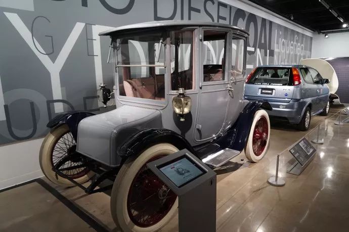 电动汽车并不是新发明,甚至比燃油车还早。这是1915年的电动车,这辆车名为底特律电动车,由安德森电动汽车公司生产,这家公司大概是从1906年经营到1939年,比当时其他电动车公司都长。车辆行驶非常安静,用两个操纵杆控制,长的用于方向,短的用于速度。最高时速20英里,续航里程80英里。