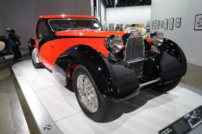 这是传奇般的1939年布加迪Type 57C Atlante。这款车是由让·布加迪设计,他是创始人挨托尔之子,既是工程师、设计师,又是赛车手,可惜30岁试车时车祸去世。这是一款快速、舒适、且优雅的车,长尾和溜背是其标志性的风格。