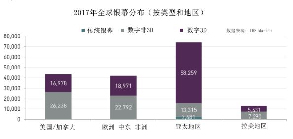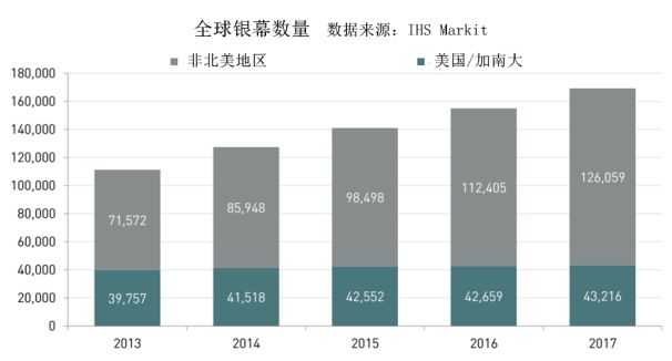 2017年,全球的电影银幕数量增长了8%,达到了17万块,增长来自于亚洲地区两位数的增长(增幅为16%)。还有一个有意思的现象是沙特阿拉伯在35年之后终于允许电影院重新开门营业。