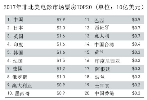 2017年,除了北美市场外,中国(79亿美元)、日本(20亿美元)、英国(16亿美元)、印度(16亿美元)等国位列全球电影票房榜前列。