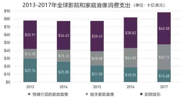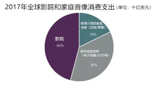2017年,如果将全球电影票房和家庭音像消费合并计算为全球电影消费额,总额达到了884亿美元,其中电影票房占比46%。数字家庭音像消费占比36%,而物理介质的家庭音像消费占比18%。