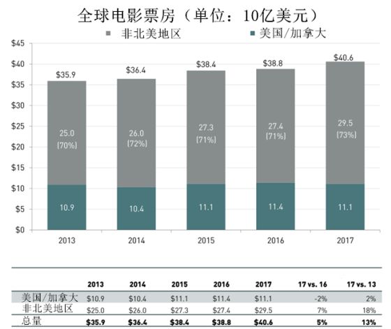 2017年,全球电影票房为406亿美元,较2016年增长了5%。其中北美电影票房下降了2%,为111亿美元,其它国家和地区的票房总计为295亿美元,较2016年增长了7%。相较于5年前,全球票房增长了13%,北美电影票房下降了2% ,其它国家和地区的票房增长了18%。
