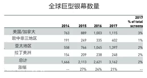 2017年,全球的巨型银幕数量较2016年增长了21%,达到了3162块。巨型银幕占全球银幕的比例仍比较小,但在全球各地巨型银幕数量都在增长。根据IHS Markit的研究,在未来的十年巨型银幕仍将保持比较快速的增长。亚太地区拥有的巨型银幕最多,为1397块,其次为北美地区1115块。