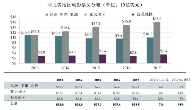 欧洲、中东和非洲地区2017年的票房较2016年增长了4%,主要增长来自俄罗斯(增长22%)和德国(增长7%)。