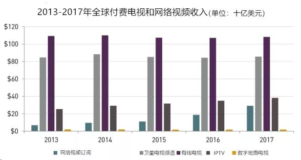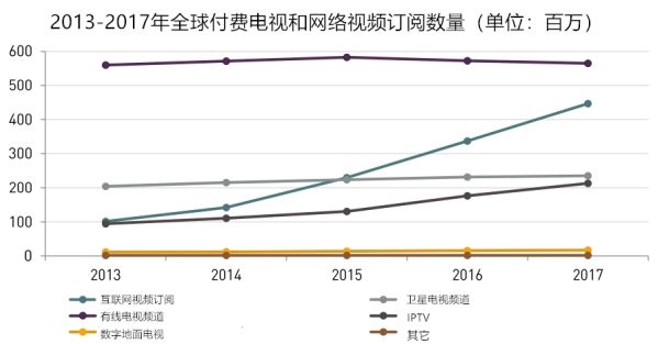 从全球来看,在线视频服务的订阅用户数量2017年较2016年增长了33%,达到了4.47亿。IPTV和卫星订阅用户数量在过去五年也有所增长。而2017年,有线电视订户数量连续第二年出现了下降。