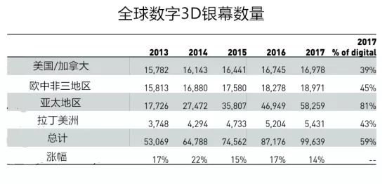 截止2017年底,世界上几乎所有的电影银幕都已是数字化的(占比高达98%),较2016年的97%继续增长。