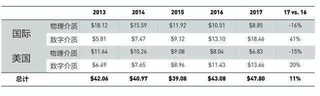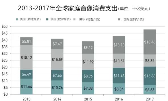 2017年,全球的家庭音像内容消费总计为478亿美元,较2016年增长11%。其中数字化的家庭音像消费是主要的增长点。美国的数字化家庭音像消费较2016年增长了20%,而国际其它地区则增长了41%。