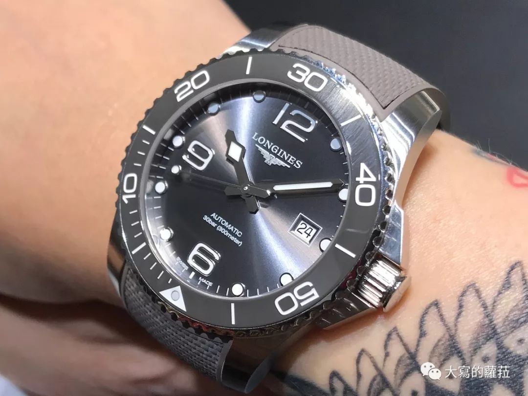 目前陶瓷材质使用在旋转表圈是最受欢迎且已蔚为主流,浪琴在康卡斯潜水系列的表圈设计上特别选了几个喑哑呈现稳重的灰、蓝、黑色调,这也是在斯沃集团制作资源优势下,浪琴准确地选择了适合品牌优雅风格的色选,搭配了简洁有力的巨大3、6、9三个阿拉伯数字时标,在同色调的太阳放射纹的映衬之下,所有元素都搭配的刚刚好。在这样的价格区间中,浪琴康卡斯潜水腕表赢过全场,也是今年所有浪琴新品中,我比较欣赏的一款。