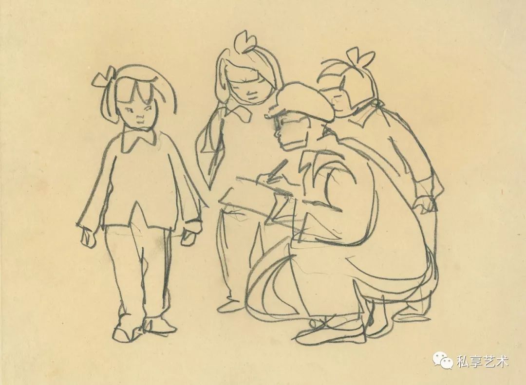叶浅予 三个小姑娘和画家 1958年 纸本铅笔 17.4×23.7cm