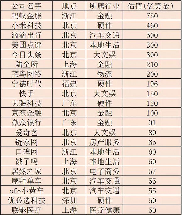 附:恒大研究院发布的独角兽名单