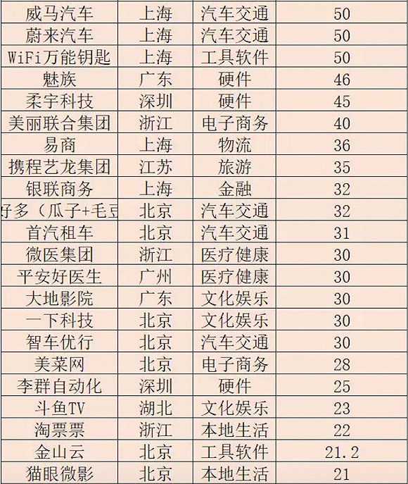 有意思的是,报告中还提到了独角兽和BAT巨头的关系。在榜单中,大约50%的企业或多或少的于BAT有关联。其中,与阿里巴巴有关联的有27家、与腾讯有关联的有37家、与百度有关联的有16家;其中于三者都有关联的有三家,分别为饿了吗、滴滴出行和汽车帮。估值方面来看,共11家估值超过100亿美金的超级独角兽企业,除了大疆科技,其他全部都与BAT有关联。因此,报告得出结论称,越是市值高的企业,与BAT关联的可能性越高。