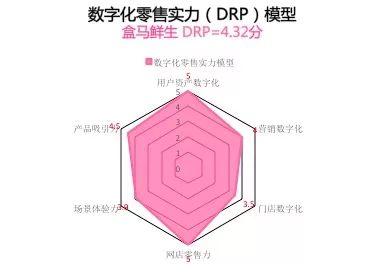 盒马鲜生DRP总分(4.32分),在零售行业处于领先水平,从6项数字化零售实力看,其中表现相对优秀的是用户资产数字化(5分)、营销数字化(4分)、网店零售力(5分)及产品吸引力(4.5分),有两个待改进项,即门店数字化(3.5分)和场景体验力(3.9分)。