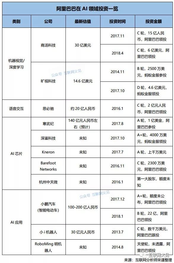 目前阿里巴巴投资的AI初创公司超过11家,捕获了4家AI独角兽,包括机器视觉和深度学习领域的代表公司商汤、旷视科技,全球第一家AI芯片独角兽寒武纪,智能电动车的代表小鹏汽车等。
