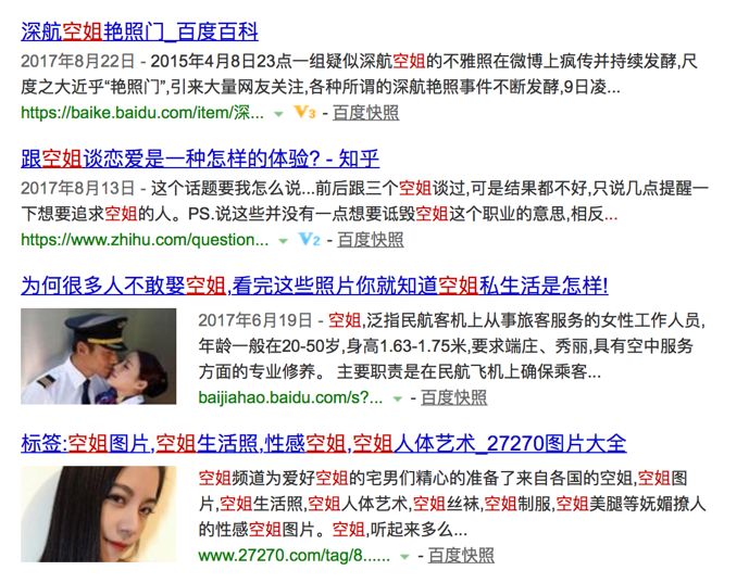 如果你在百度里打上“空姐”二字,热门推荐里的内容甚至不亚于误入了情色网站。满屏的“胸器”、“大长腿”、“小蛮腰”,简单、粗暴、直接地将这一物化形象肢解为各个身体部位;更可笑的是,这恰恰正是着装要求背后的观赏逻辑——男权滤镜下,对女性身体的物化。这种着装要求,是需要被抵制和亟待改革的。