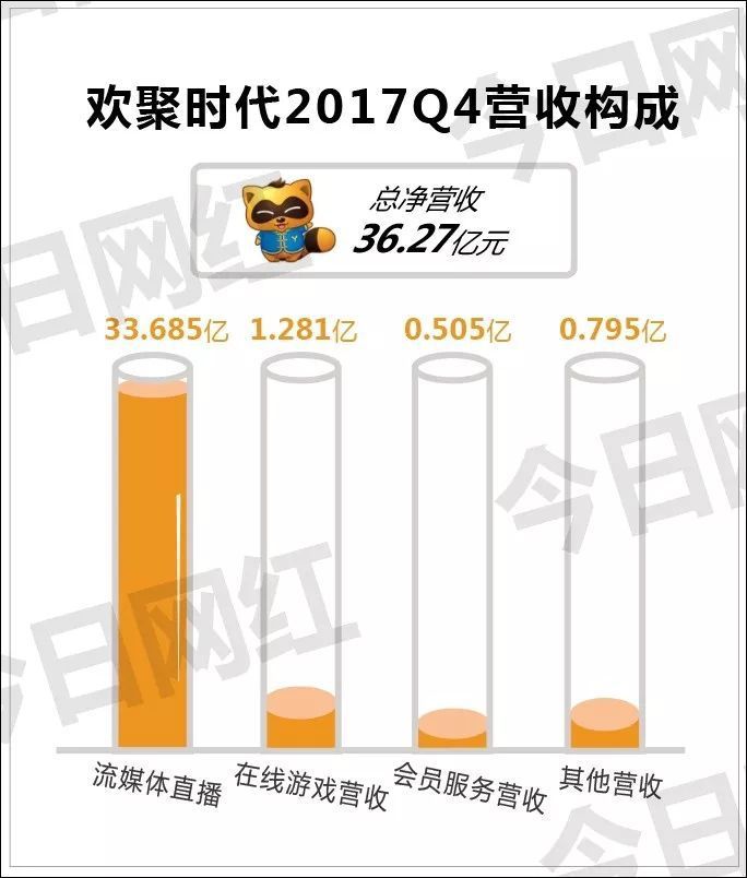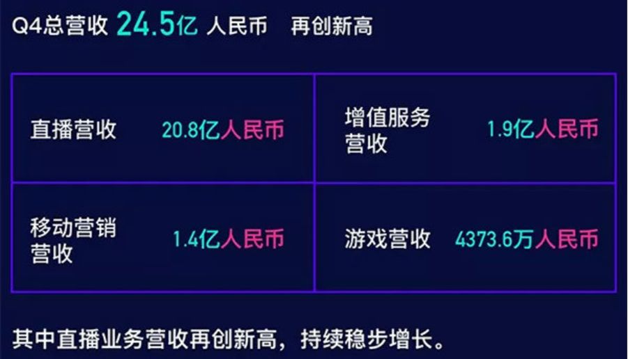 流媒体直播继续成为欢聚时代的主要营收。在第四季度近36.27亿元的总营收中,流媒体收入33.685亿元,占比高达92.9%。其中YY流媒体收入26.758亿元,虎牙营收6.927亿元。